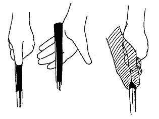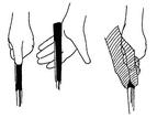 Legg køllen i venstre (høyrehendte) hånd slik at den hviler mest på fingrene. Plasser tommelen litt på høyre side av grepet og slik at du ser 2-3 knoker. Legg høyre hånd over venstre hånds tommelfinger. Venstre hånds tommelfinger skal forsvinne bak livslinjen i høyre hånd. Husk at dette blir motsatt for den som spiller fra venstre.