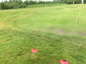 Marker utslagssteder rundt trenigsgreenen med kjegler. Lag en bane med 6 eller 9 hull. Del in spillerne i grupper om 2-3 og spill banen. La gjerne spillerne bruke scorekort.