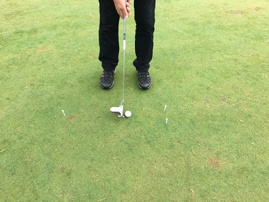 Trykk ned en peg i bakken der hvor ballen skal plasseres. Sett en pegg bak for riktig lengde på baksving i forhold til hvor lang putten er. Sett en port med to pegger foran for passe lang fremsving. Spilleren skal prøve å senke putten med riktig lengde på baksvingen.