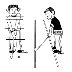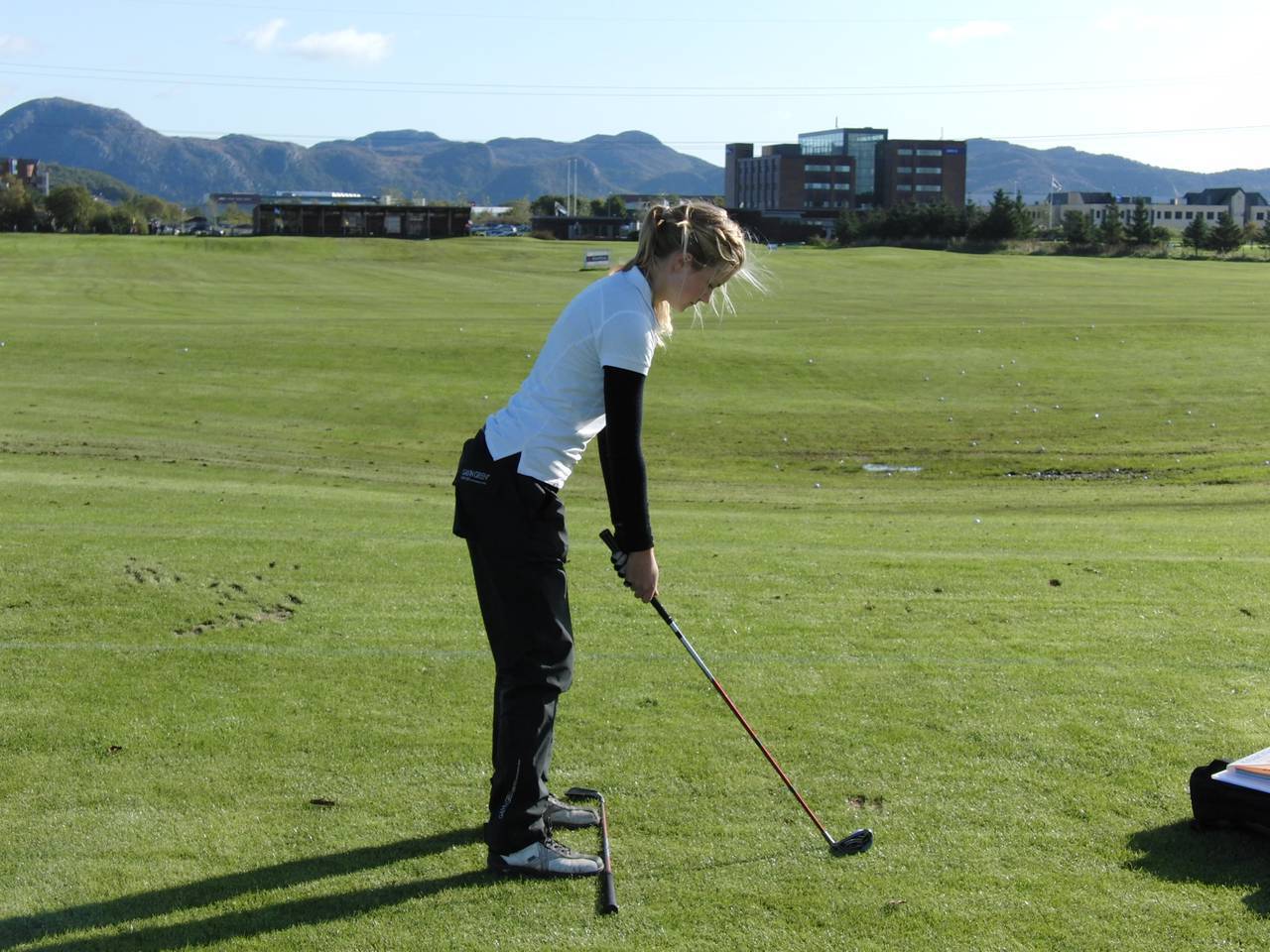 - Kroppen, med skuldre, hofter og føtter, er stilt parallelt med linjen mellom kølleblad og mål