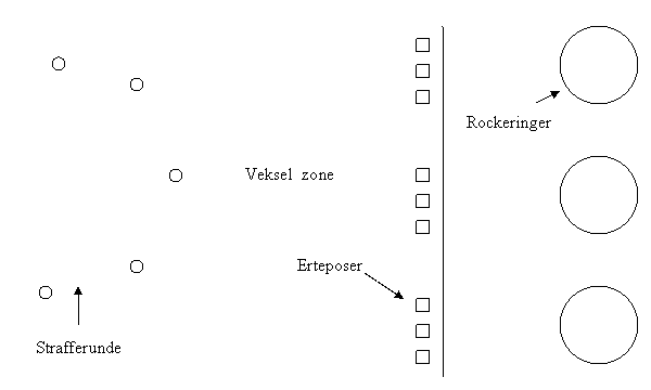 Ved start/veksling finnes det "skyteområde". Dette kan være rokkeringer som ligger på bakken, evt. store plastbøtter. Deltagerne skal etter hver sløyfe kaste 3 erteposer/kongler i rokkeringen. Hvis de treffer med alle tre erteposene/konglene får de lov til å ta et nytt kart og løpe ut på en ny runde eller la andremann på laget løpe ut. For hver ertepose de bommer må de løpe en strafferunde (strafferunden kan for eksempel være en ring av kjegler). Strafferunden bør ikke være for lang. Max 10-20 sek per runde.