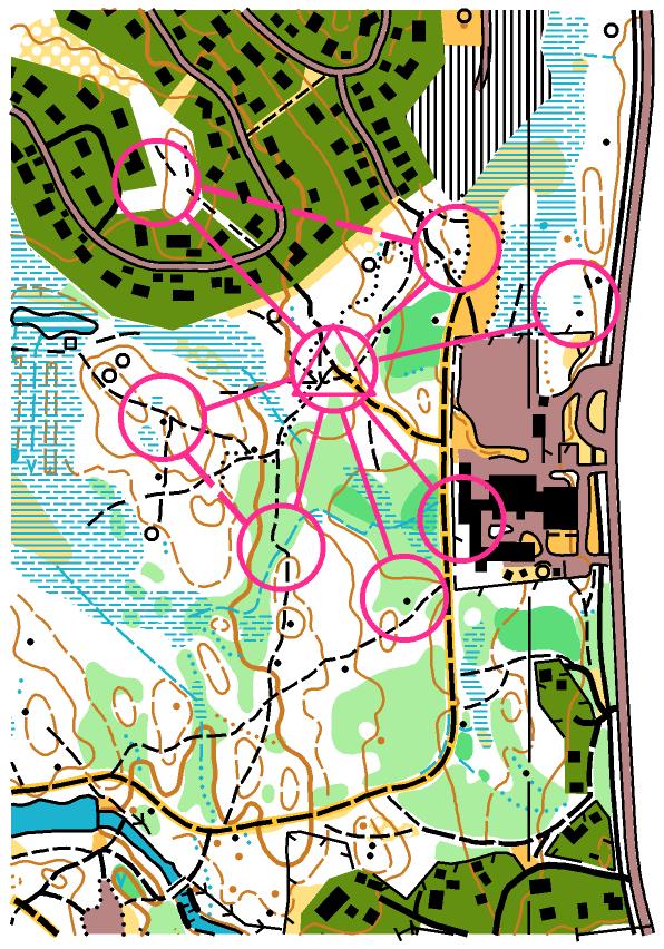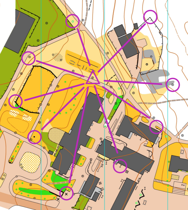 10-20 Poster henges ut på tydelige detaljer rundt et felles startområde (stjerneform) Avstand fra startpunkt til hver post kan variere fra ca. 50-150 meter. Hver post tegnes inn separat på et kart markert med starttrekant, postsirkel, postnummer og strek mellom.