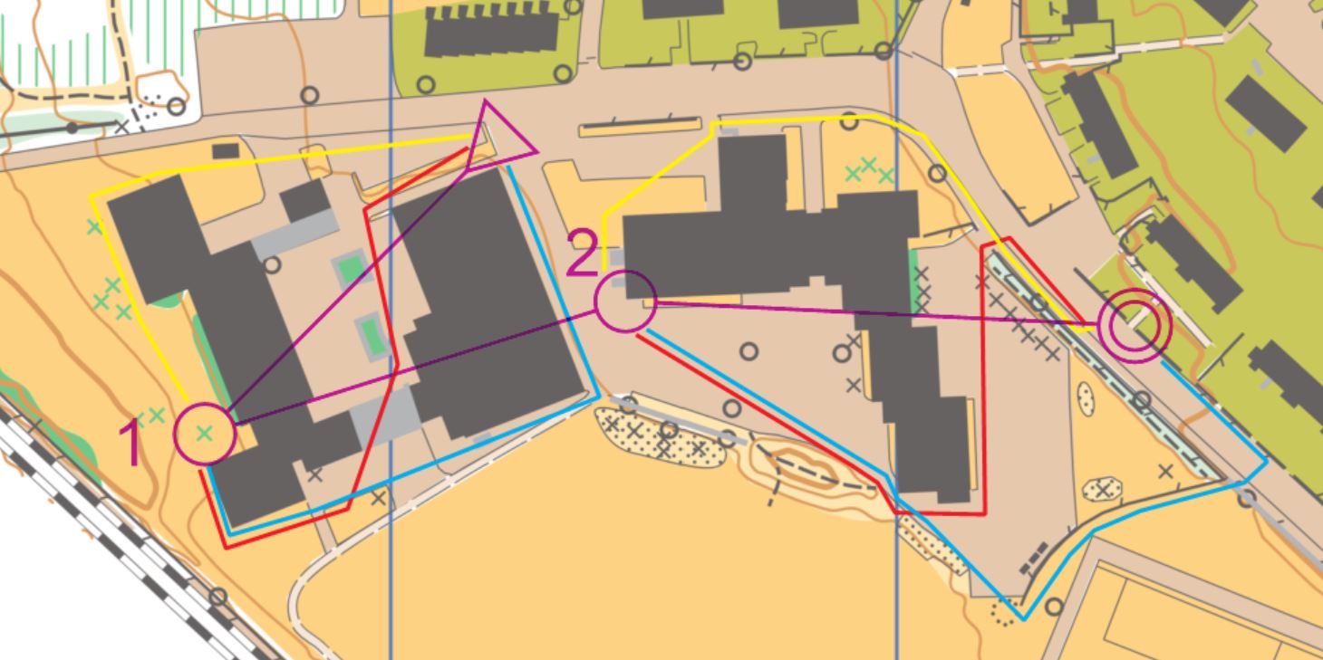 1. To og to deltakere kan jobbe sammen. De diskuterer veivalg, velger hvert sitt, og ser hvem som kommer først til neste post. Vent på hverandre ved hver post. 2. Noen av veivalgene kan være tegnet på kartet i ulike farger på forhånd, slik at det blir enklere for deltakeren å se hvilke valg han har. 3. Kan også gjøres som en variant av stjerneorientering, der deltakeren må løpe en vei til posten og en annen vei tilbake til startstedet. Husk at det må være flere ulike veier til posten. (Karteksempelet fungerer derfor dårlig om deltakeren skal løpe fra start og direkte til post 2.) 4. Samtale etterpå: er det alltid slik at det veivalget som ser kortest ut er det raskeste?