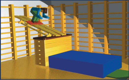 Utøveren setter seg på den øverste ribben i ribbeveggen, legger teppeflisene undre fotsålene, setter seg i riktig sittestilling og slipper seg utfor. (Se bilde). Teppeflisene som brukes bør gli godt slik at ingen får seg ubehagelige overraskelser.á