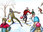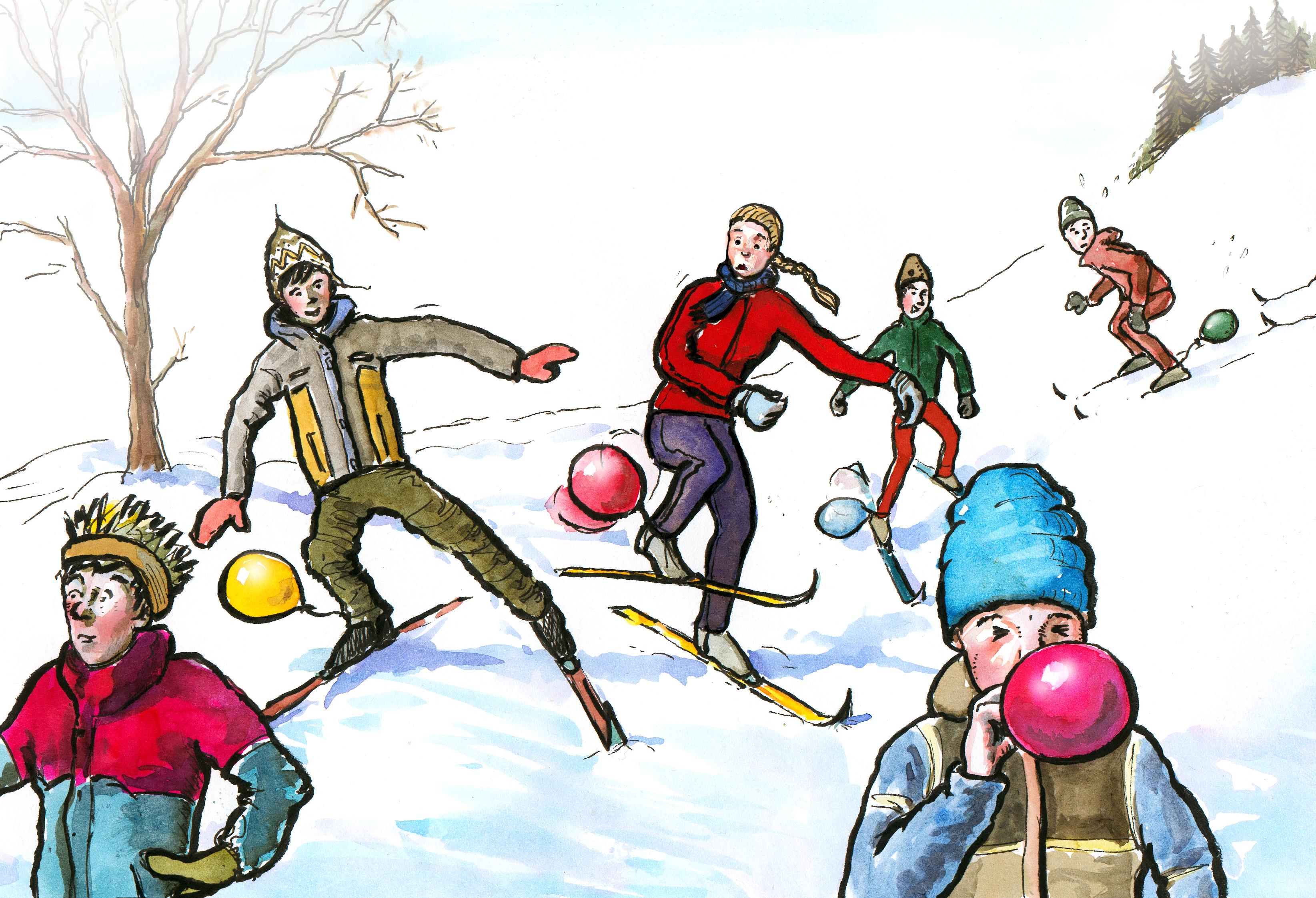 Ballongen festes til langrennskjelken. Utøver bruker staver til å sprekke andres ballong.